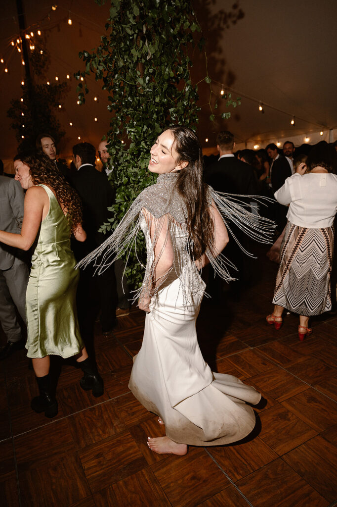 Guests flowed effortlessly throughout the day—from riverside vows to cocktails on the back deck, and into a tented reception featuring a warm, family-style dinner. The celebration continued with an evening of dancing under the canopy of greenery and twinkling string lights.